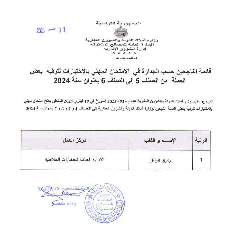 قائمات الناجحين حسب الجدارة في الإمتحان المهني بالإختبارات بعنوان سنة 2024. Post published:3 ديسمبر 2025 Post category:الأخبار / مناظرات داخلية قد يعجبك ايضا الاتفاق على تسوية وضعية “ضيعة جمنة” في إطار قانون الاقتصاد الاجتماعي والتضامني. 23 فبراير 2021 جلسة عمل في وزارة املاك الدولة و الشؤون العقارية بخصوص ضيعة “الطرفة ” في دوز الجنوبية تقرّ إرجاع ضيعة كبرى للدّولة. 23 فبراير 2021 حول تسوية الوضعية العقارية للتجمع السكني المعروف ب”حي المحطة” الكائن بمعتمدية نبر من ولاية الكاف 3 أبريل 2025