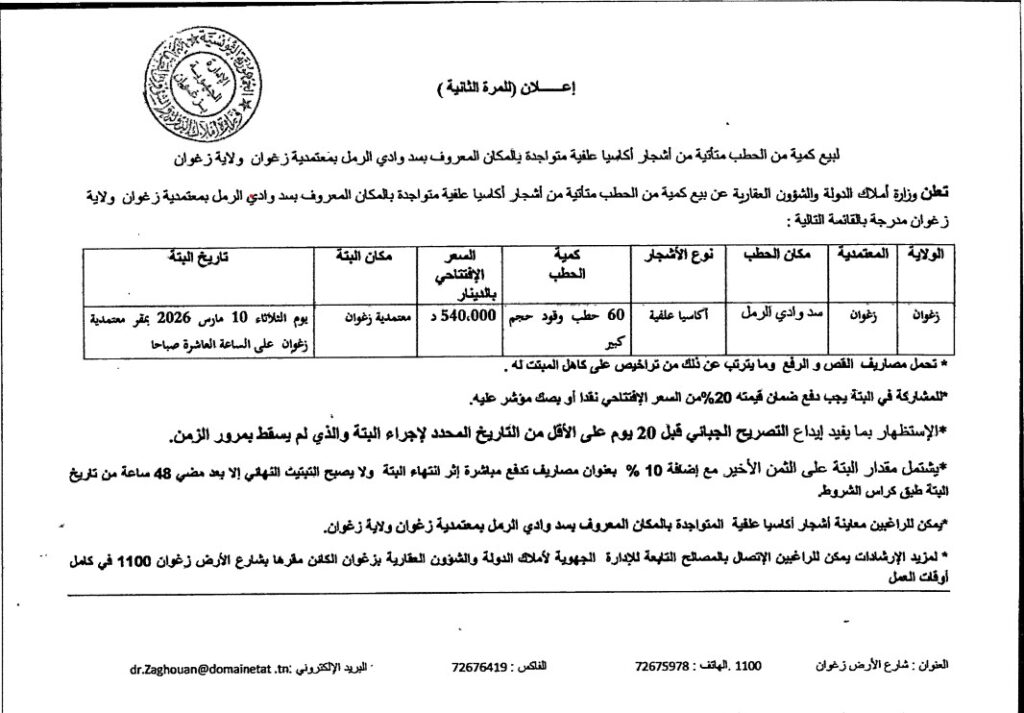 إعلان بتة لبيع كمية من الحطب متأتية من أشجار أكاسيا علفية متواجدة بسد واد الرمل ولاية زغوان Post published:23 فبراير 2026 Post category:الإعلانات / بتات وكراءات قد يعجبك ايضا كراء عقار دولي فلاحي كائن بمعتمدية الميدة بولاية نابل 23 فبراير 2021 إعلان عن بتة لبيع غراسات قوارص معدة للتقليع كائنة بمعتمدية منزل بوزلفة من ولاية نابل يوم الثلاثاء 18 جويلية 2023 5 يوليو 2023 علان بيع عقار بالمزاد العلني بتطاوين 23 فبراير 2021