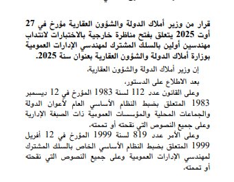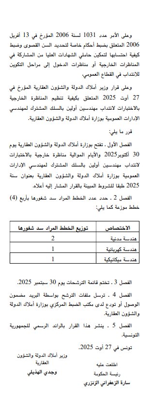 صدر يوم الجمعة 29 أوت 2025 بالرائد الرسمي للجمهورية التونسية قرار صادر عن السيد وزير أملاك الدولة و الشؤون العقارية يتعلق بفتح مناظرة خارجية بالاختبارات لإنتداب مهندسين أوليين بالسلك المشترك لمهندسي الإدارات العمومية بوزارة أملاك الدولة و الشؤون العقارية بعنوان سنة 2025.