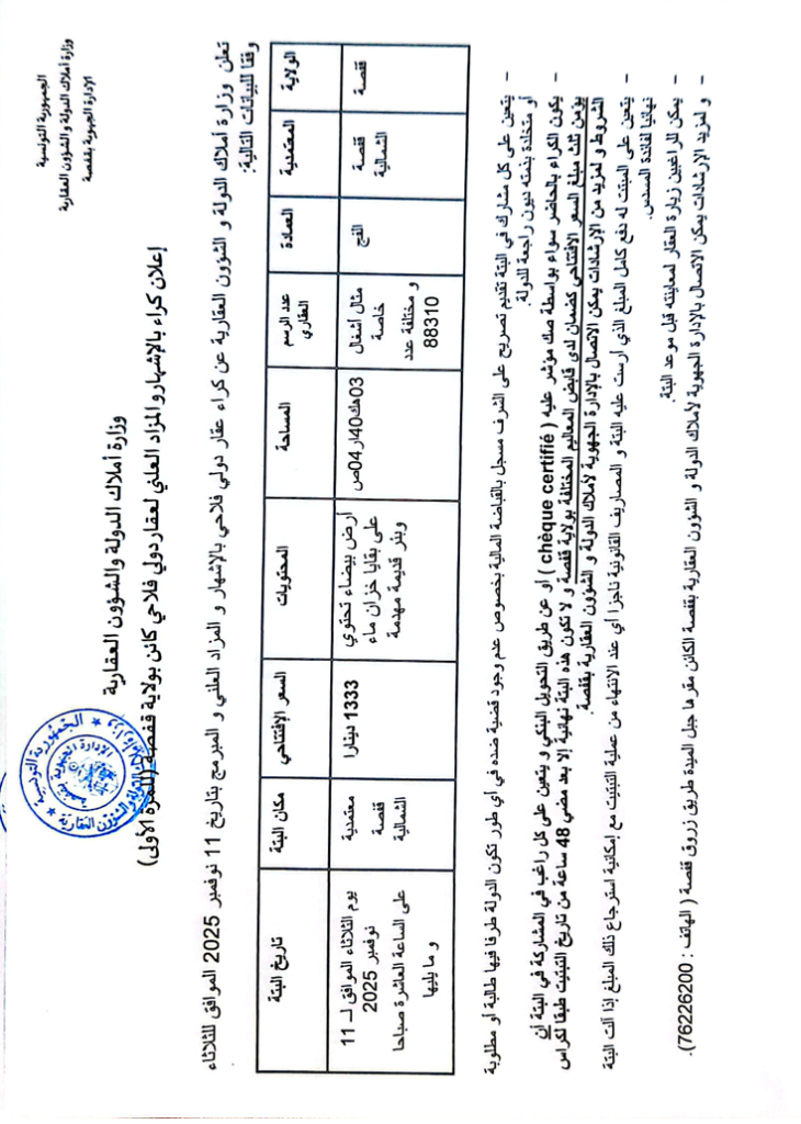 اعلان عن كراء بالمزاد العلني لمقطع حجارة رخامية كائن بمنطقة برج الحمام عمادة شمتو ولايـــــة جندوبـــــة 23 فبراير 2021