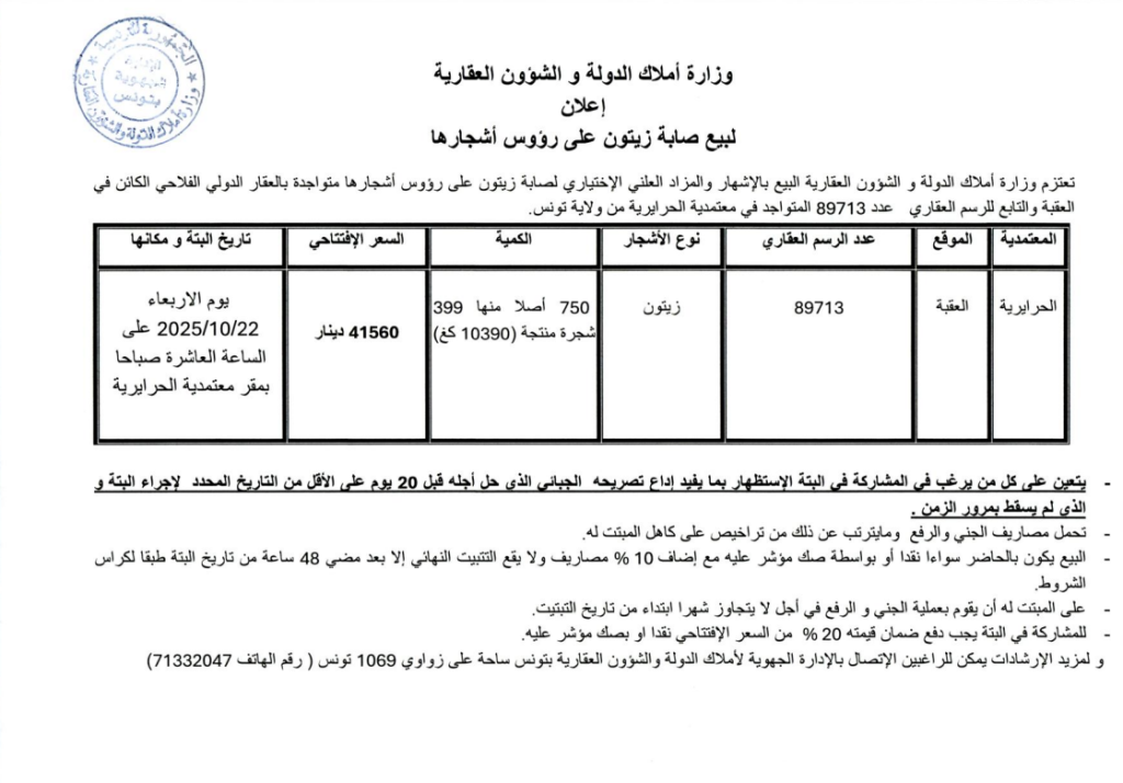 تعتزم وزارة أملاك الدولة و الشؤون العقارية البيع بالإشهار و المزاد العلني الإختياري كمية من حطب الزّيتون متواجدة بالمنبت الغابي بمنزل النور معتمدية بنبلة من ولاية المنستير حسب الجدول التّالي 25 سبتمبر 2023