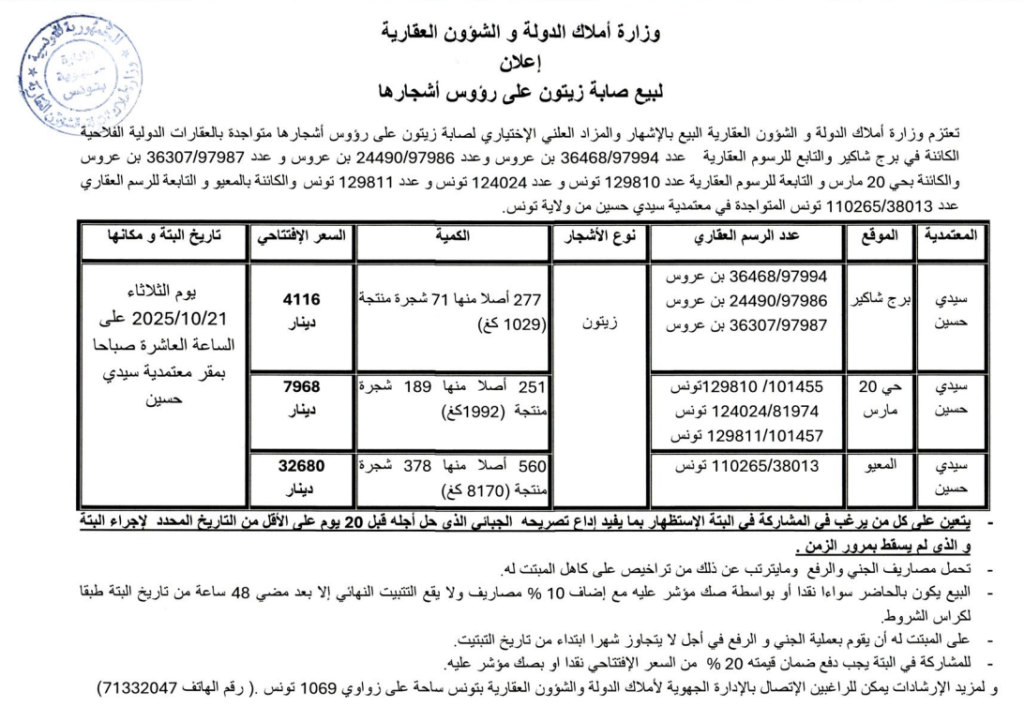 إعلان لبيع صابة زيتون على رؤوس أشجارها بعقار كائن بمعتمدية سيدي حسين بولاية تونس Post published:16 أكتوبر 2025 Post category:بتات وكراءات قد يعجبك ايضا إعلان بتّة لبيع كمية من حطب الكلاتوس بمعتمدية نبر ولاية الكاف 5 نوفمبر 2021 وزارة أملاك الدولة و الشؤون العقارية إعــــلان لبيع كميات من الحطب مستخرجة بعد عملية قلع أشجار غابية  20 أكتوبر 2022 إعلان عن بتة لبيع كمية حطب متأتية من أشجار غابية متواجدة بمركز الغابات بالمريسة من معتمدية سليمان ولاية نابل يوم 09 مارس 2023 28 فبراير 2023