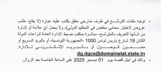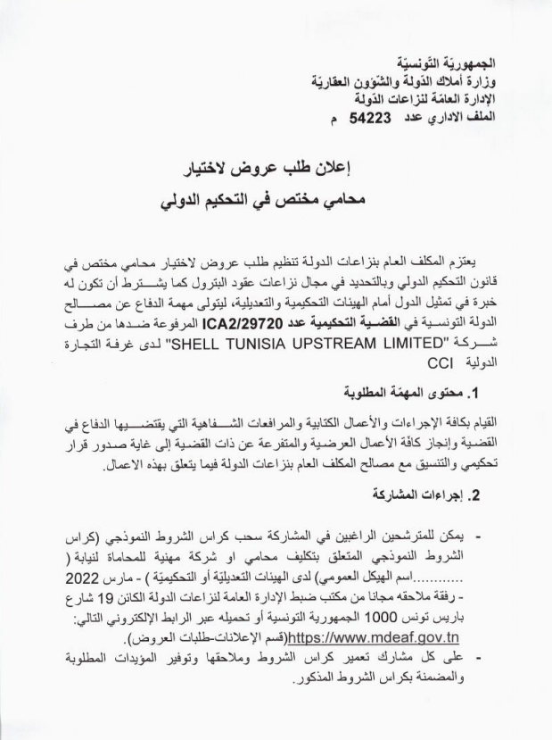 إعلان طلب عروض لاختيار محامي مختص في التحكيم الدولي Post published:20 نوفمبر 2025 Post category:الأخبار / الإعلانات / طلبات العروض قد يعجبك ايضا إعلان بتّة عمومية لبيع كمية من الحطب متأتية من أشجار سرول معدة للقطع كائنة بمعتمدية السرس ولاية الكاف 7 مايو 2025 إعلان بتّة لبيع كمية من الحطب بالمدرسة الإعدادية ببرج العيفة من معتمدية نبر ولاية الكاف 12 أغسطس 2022 اعلان بيع عن طريق الظروف المغلقة للمرة الاولى لاثاث و معدات زال الانتفاع بها تابعة لأمانة المال الجهوية بقفصة 23 فبراير 2021